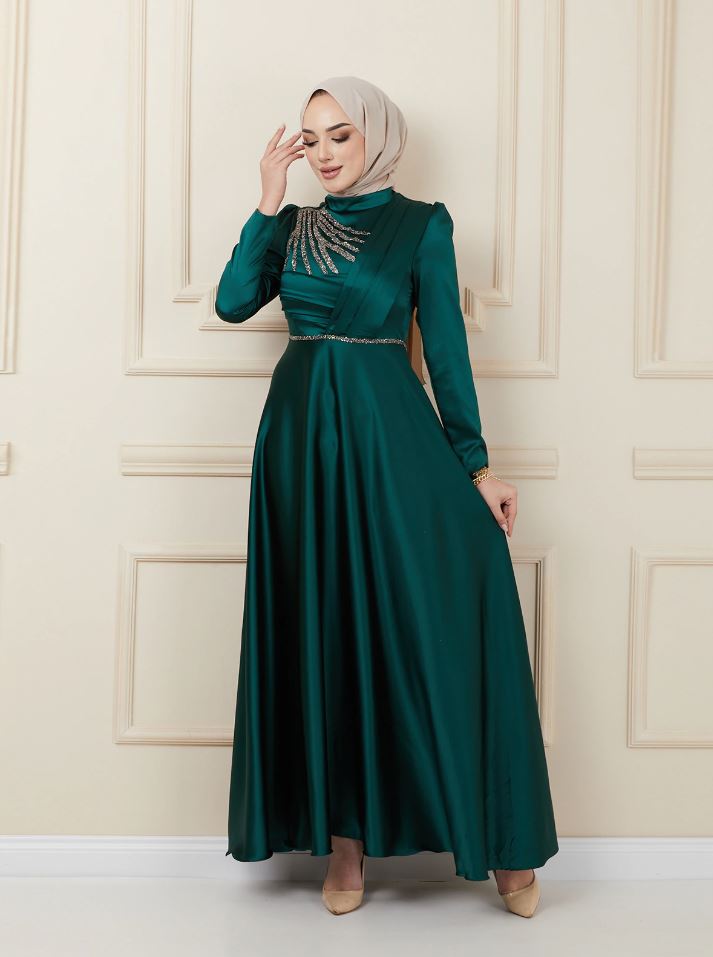 Önü Pilise ve Boncuk Detaylı Saten Tesettür Abiye Elbise - Yeşil